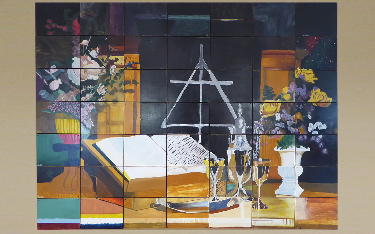 Vanderwall described how they took a photograph of the staged table, made a large print and then applied a rectangular grid to it. “Following that, we cut the print into sections as defined by the grid and then handed out the sections, along with a proportionate panel to participating artists and asked them to paint the section of the grid they had been assigned.” Some artists did more than one. Once all the 49 segments had been translated into paintings, “the finished tiles were attached to a large wooden framework with four small inconspicuous screws, one in each corner of each tile,” Goodreau said.
