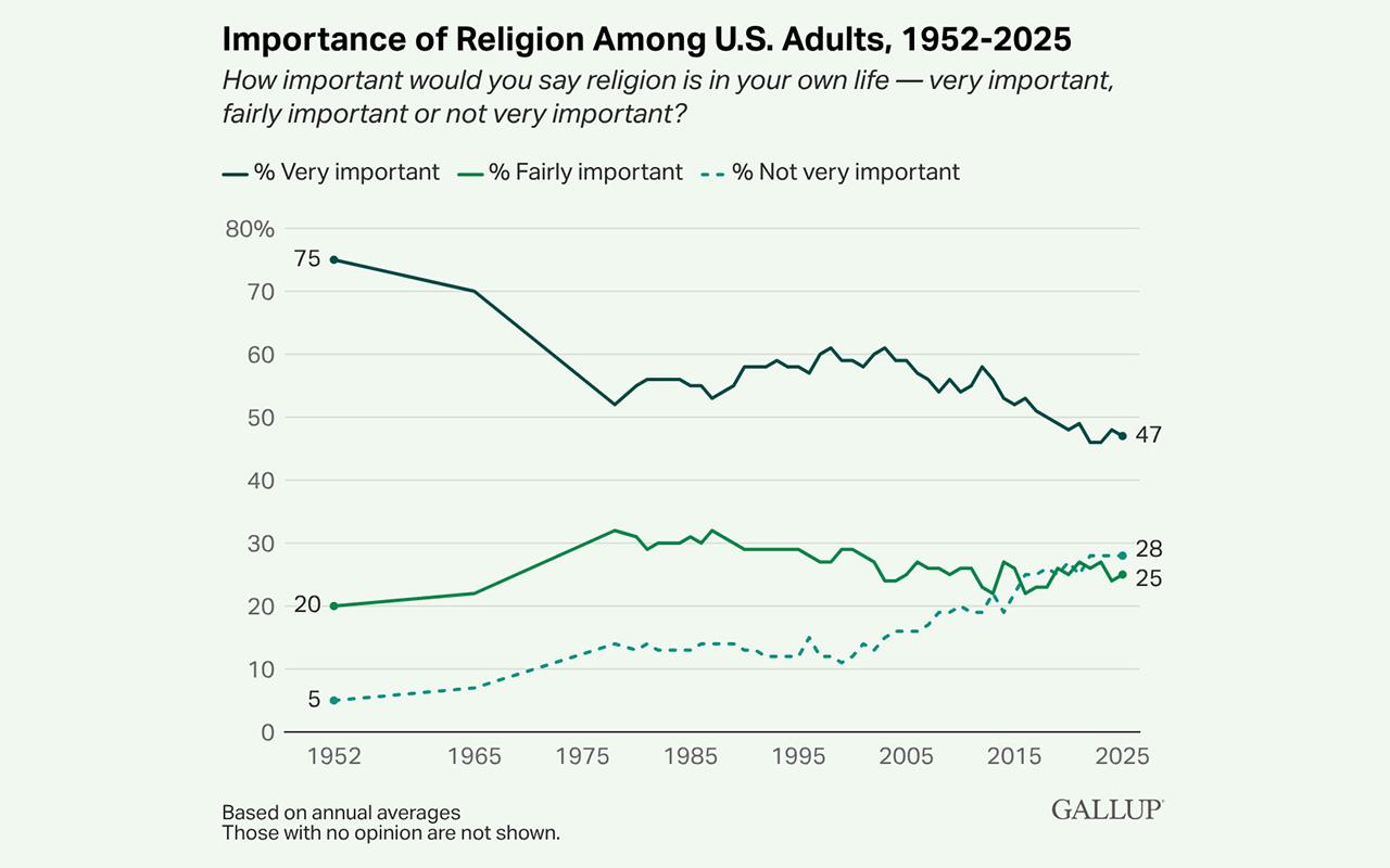 The percentage of Americans who say religion is “very important” in their lives seems to have leveled off, having been up or down 1 percentage point since 2021, and sitting at 47% in 2025, according to a new Gallup Poll released March 3.